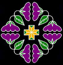 Rangoli is a very popular form art in India. It is usually drawn by Indian women in front of their doors or gates. Although the basic color of Rangoli is white (known as "chirodi'), it is dyed different colors creating an attractive, multi-colored design.