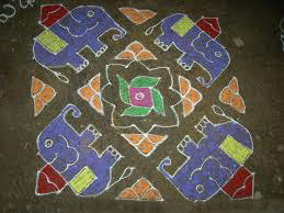 Rangoli is a very popular form art in India. It is usually drawn by Indian women in front of their doors or gates. Although the basic color of Rangoli is white (known as "chirodi'), it is dyed different colors creating an attractive, multi-colored design.